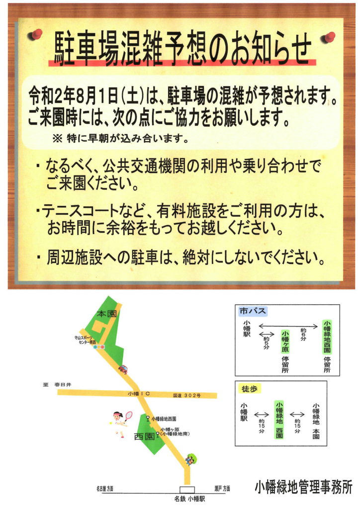 8月1日(土)は小幡緑地(西園)で開催のスポーツ大会やイベント等で、早朝から駐車場の混雑が予想されます。ご利用を予定されている方は、時間に余裕をもってお越しください。