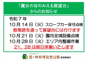 魔女の谷のみえる展望台からのお知らせ【休業日およびスロープカー運休日】