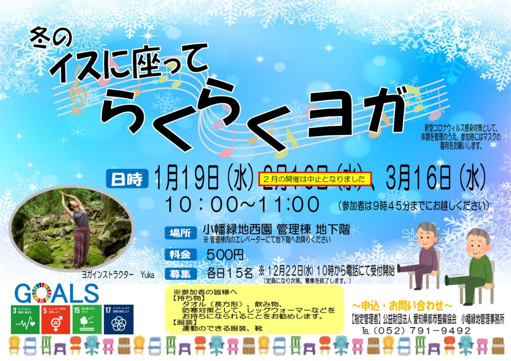 2月の「イスに座ってらくらくヨガ」の開催を中止いたします。