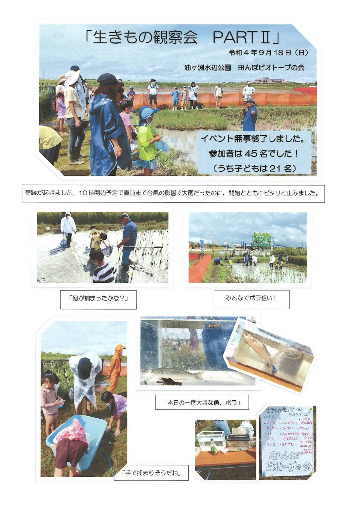 2022年9月18日 『生き物観察会』を開催しました。 更新日 2023/07/10 田んぼビオトープの会との協働イベント 『生き物観察会 PART②』を開催しました。 ご参加いただき、ありがとうございました。