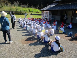 御津北部小学校1、2年生66名を迎え、《憩いの広場》にて、藍の種取り体験をしていただきました。