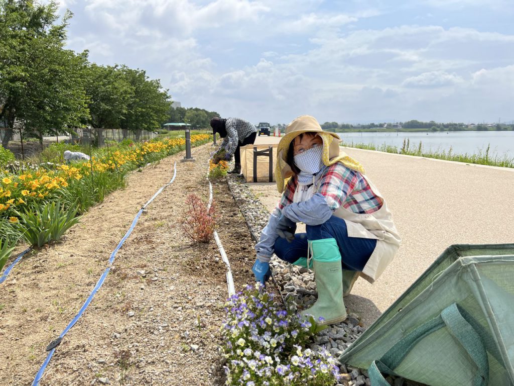 水生花園(碧南市)の油ヶ淵堤防周辺で、なごみ会の方々が花の植替えの為、除草作業を行いました。沿道には黄色いマンシュウキスゲが咲いています。