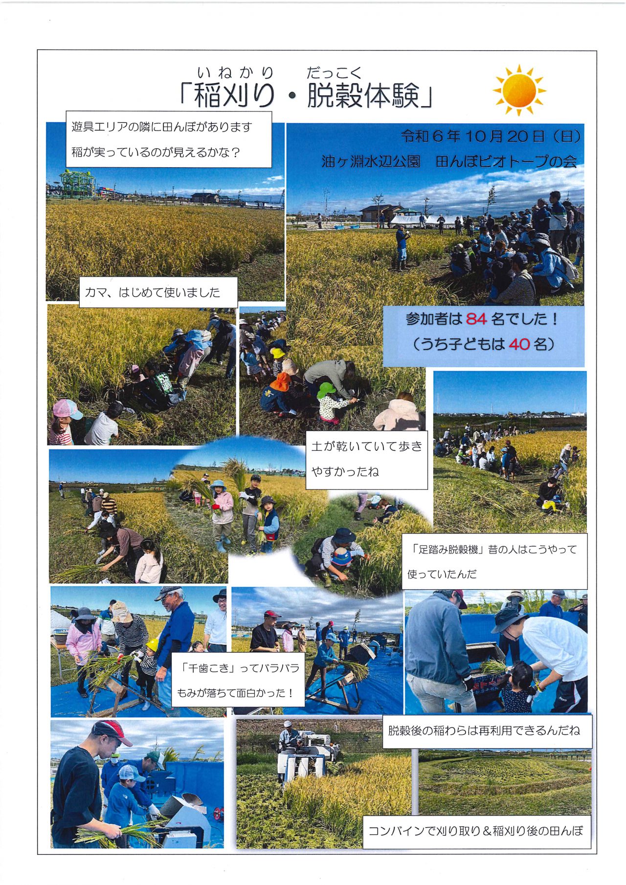 2024年10月20日 『稲刈り・脱穀を体験をしよう!』を開催しました。 更新日 2024/11/21 田んぼビオトープの会との協働イベント 『稲刈り・脱穀を体験しよう!』を開催しました。 ご参加いただき、ありがとうございました。