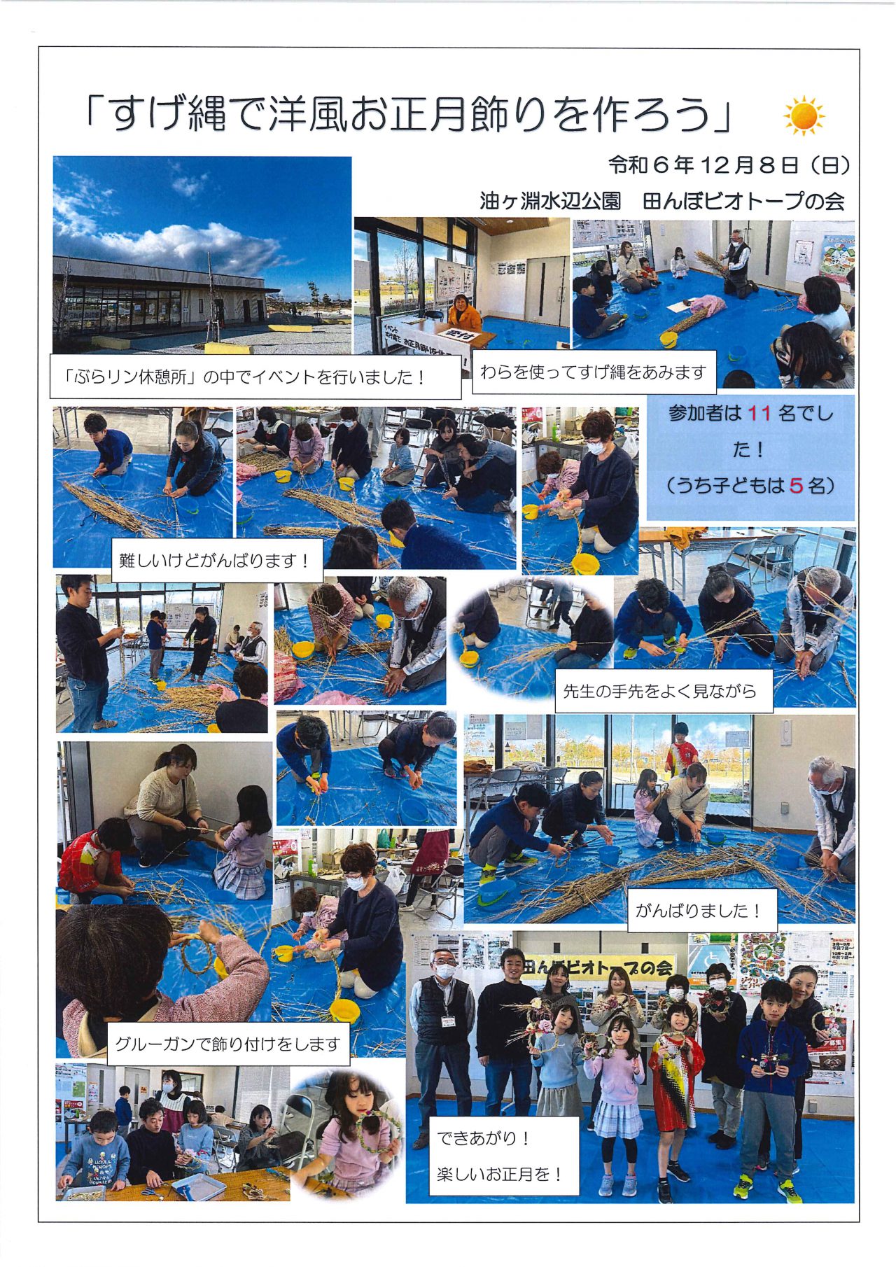 2024年12月8日 『すげ縄で洋風お正月飾りを作ろう!』を開催しました。 更新日 2024/12/18 田んぼビオトープの会との協働イベント 『すげ縄で洋風お正月飾りを作ろう!』を開催しました。 ご参加いただき、ありがとうございました。