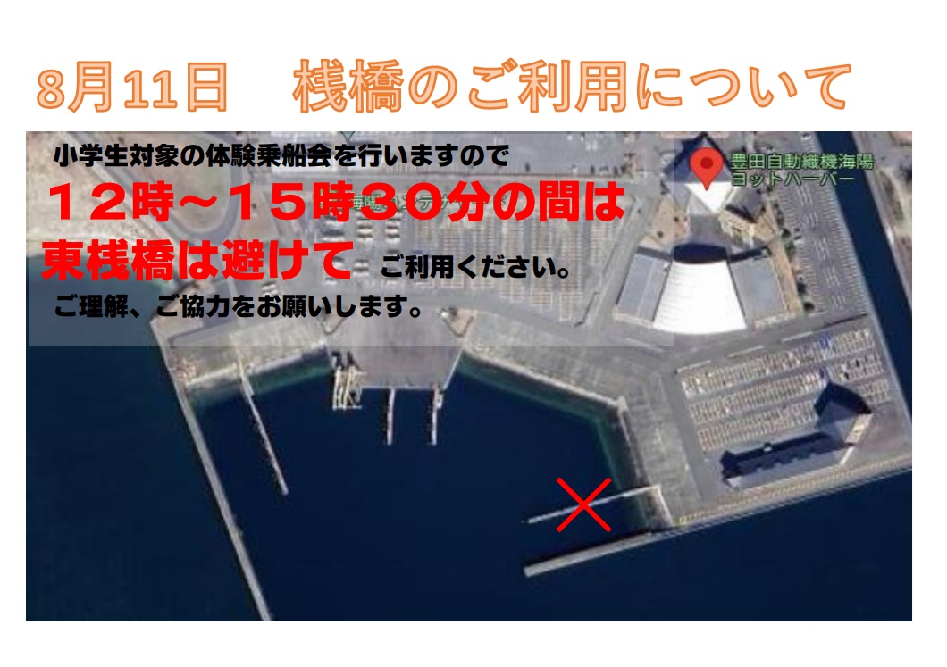 8月11日の桟橋利用について 更新日 2024/07/24 8月11日(日)はイベント開催に伴い、浮桟橋を一部規制させていただきます。 ご迷惑をおかけしますが、ご理解・ご協力の程よろしくお願いいたします。 8.11桟橋案内