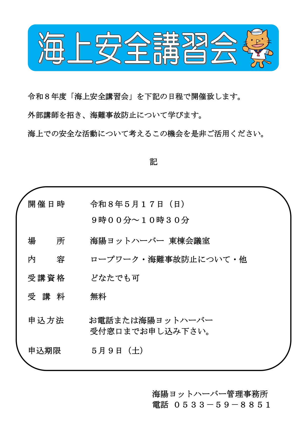 令和8年度海上安全講習会 開催日 2026/05/17 外部講師を招き、海難防止について学びます。 海での安全な活動について考えるこの機会を是非ご活用ください。 開催日時 令和8年5月17日(日) 9時00分~10時30分 場 所 海陽ヨットハーバー 東棟会議室 内 容 ロープワーク・海難事故防止について・他 受講資格 どなたでも可 受 講 料 無料 申込方法 お電話または海陽ヨットハーバー 受付窓口までお申し込み下さい。 申込期限 5月9日(土) 募集案内はこちら 申込用紙はこちら