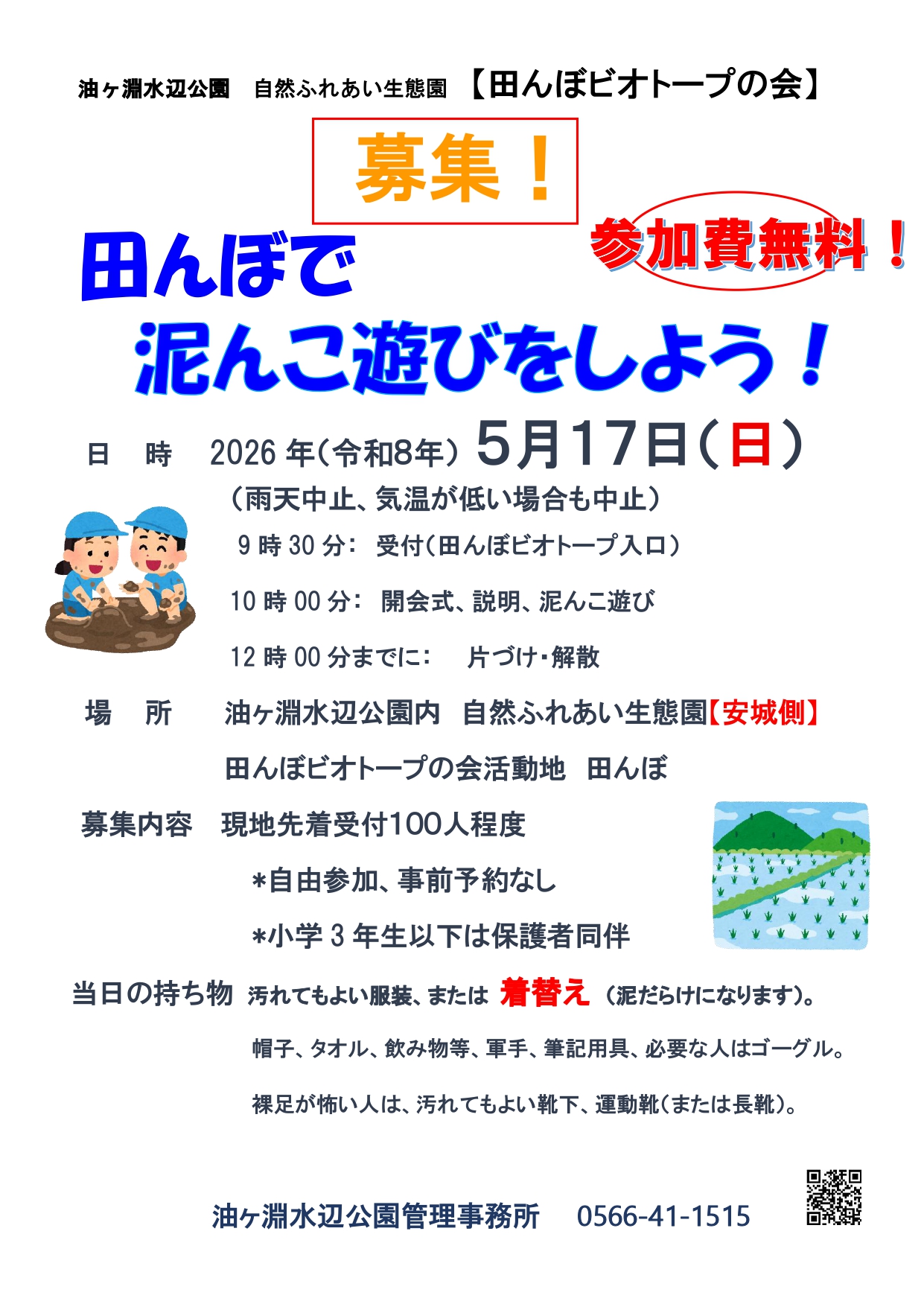 田んぼビオトープの会との協働イベント「田んぼで泥んこ遊びをしよう!」を開催します。