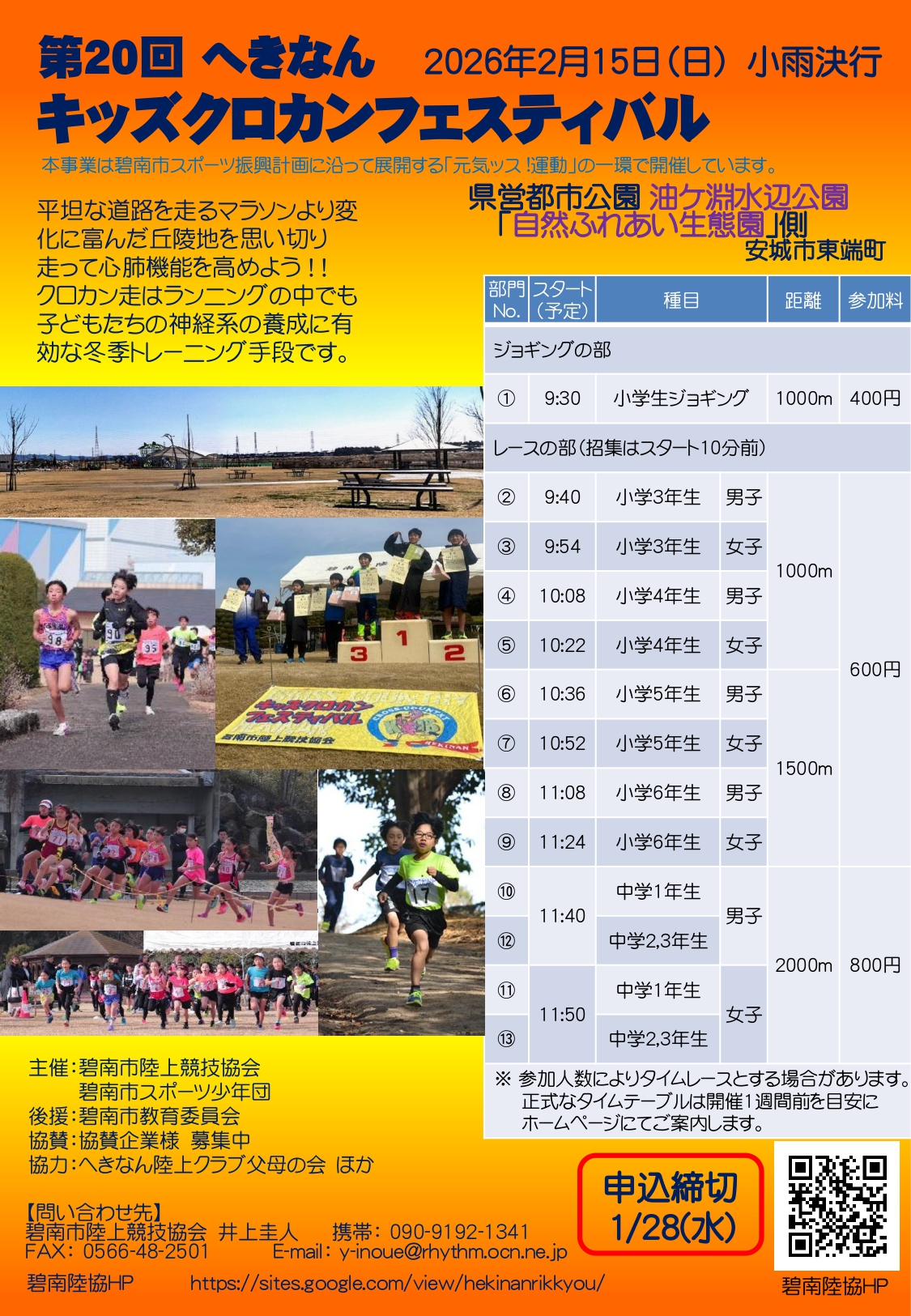へきなんキッズクロカンフェスティバル 開催日 2月15日(日) 毎年恒例の「へきなんクロカンロングディスタンス」! このキッズ大会が開催されます☆ へきなんキッズクロカンフェスティバルは、毎年ほかの会場で開催されていますが 今年は、キッズ大会も当園で開催! 1月28日までエントリー受付中ですので、ぜひお申込みください♪ ◆日時 2月15日(日)8:30~12:00ごろ ◆場所 自然ふれあい生態園(安城) ◎くわしくは ⇒ コチラ ◎エントリーは コチラ