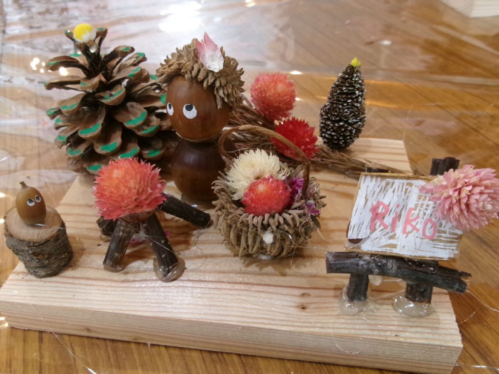 どんぐりなどの木の実や小枝だけでなく、今回は園内で育てた千日紅やケイトウの