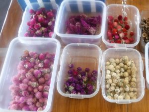 どんぐりなどの木の実や小枝だけでなく、今回は園内で育てた千日紅やケイトウの