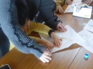 真っ白な紙を折って竹ひごに貼って、絵を描いて糸を通して