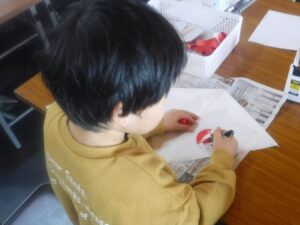 真っ白な紙を折って竹ひごに貼って、絵を描いて糸を通して