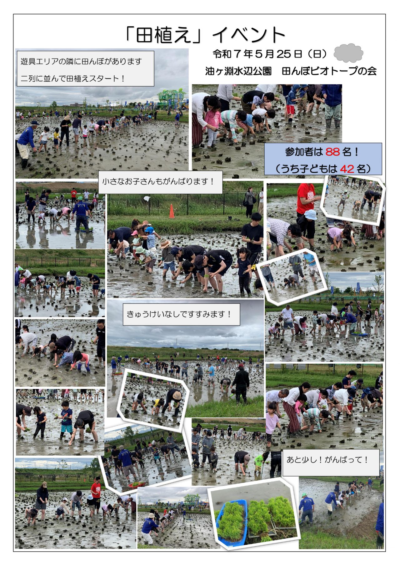 当園へ遊びにきていただいた際には、みなさんに植えていただいた稲苗が