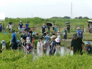 今回はビオトープだけでなく、田んぼの中に入ってアカミミガメの食害に