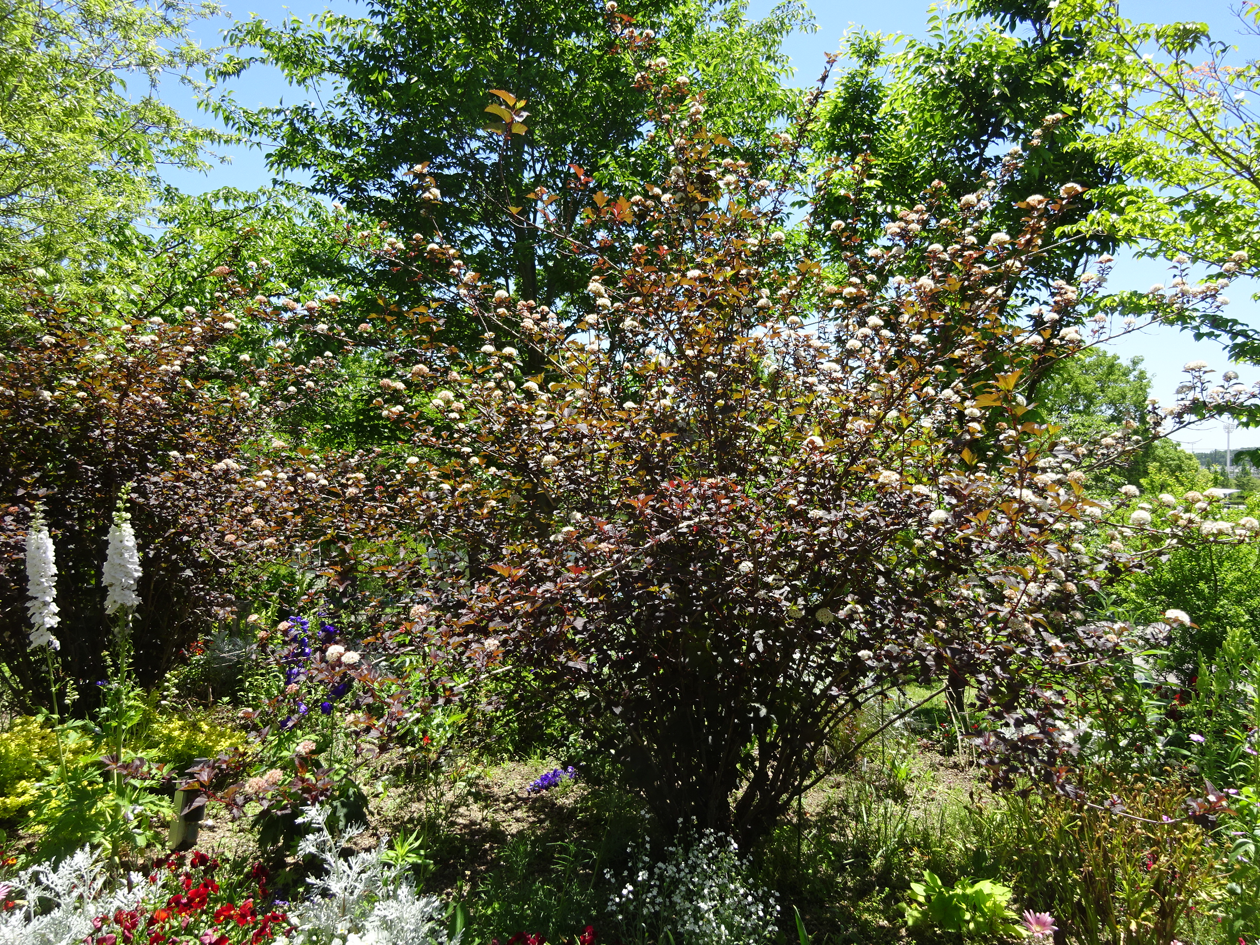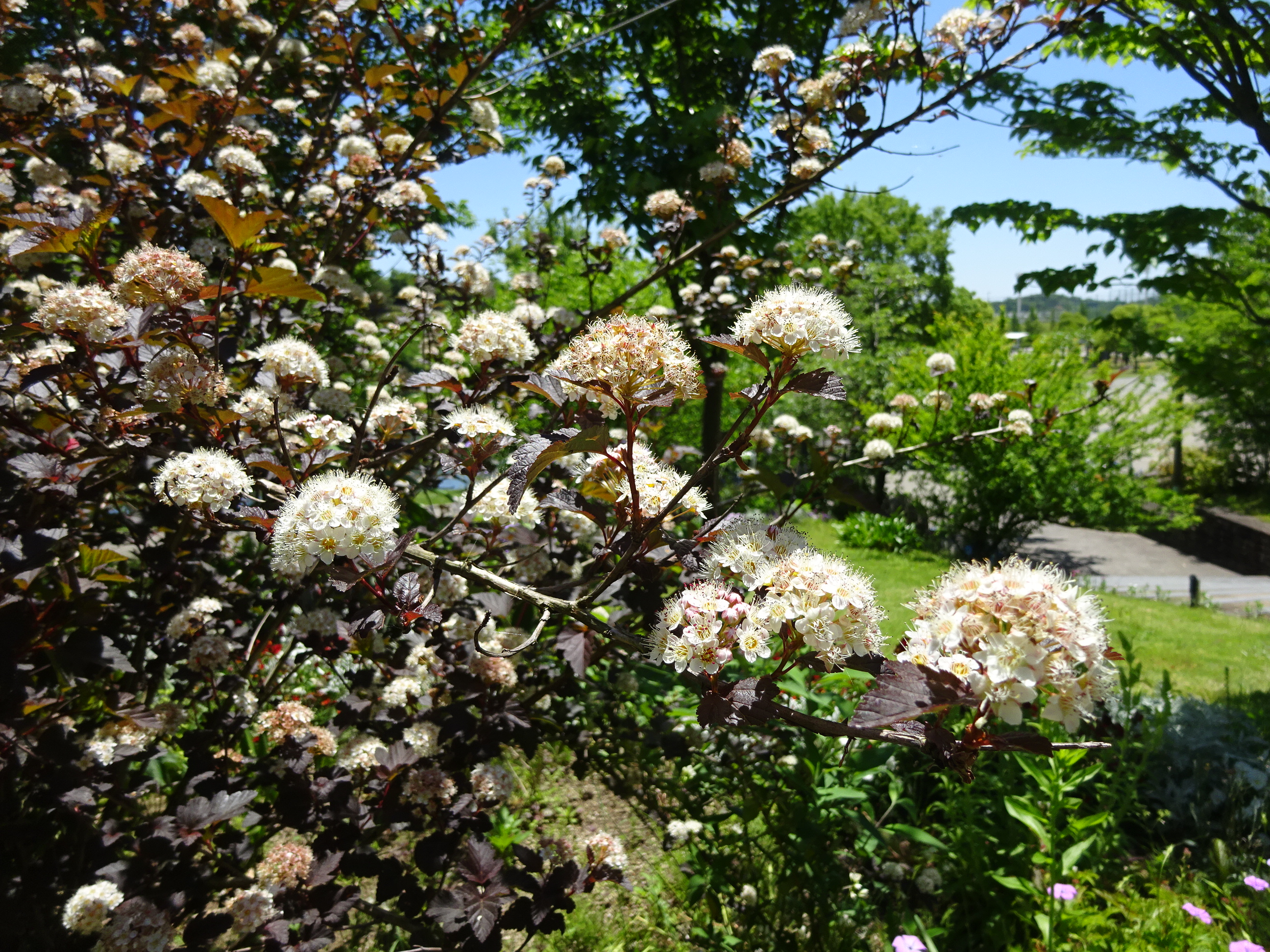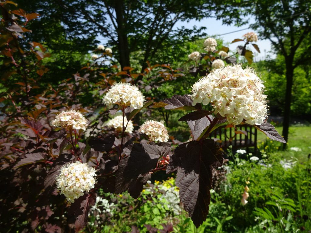 大花壇でアメリカテマリシモツケが、名前の通り手毬のような花を咲かせています。