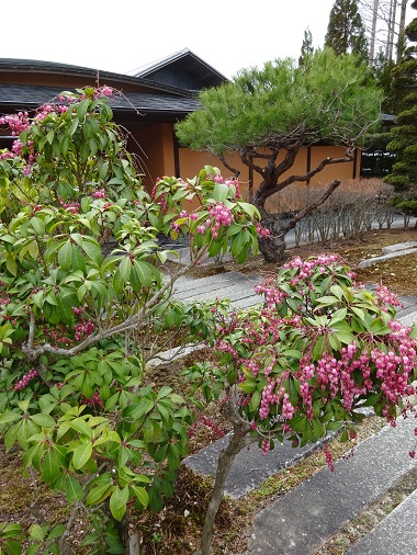 日本庭園茶室「香流亭」の入り口横にあるアセビは薄紅色をしています。