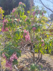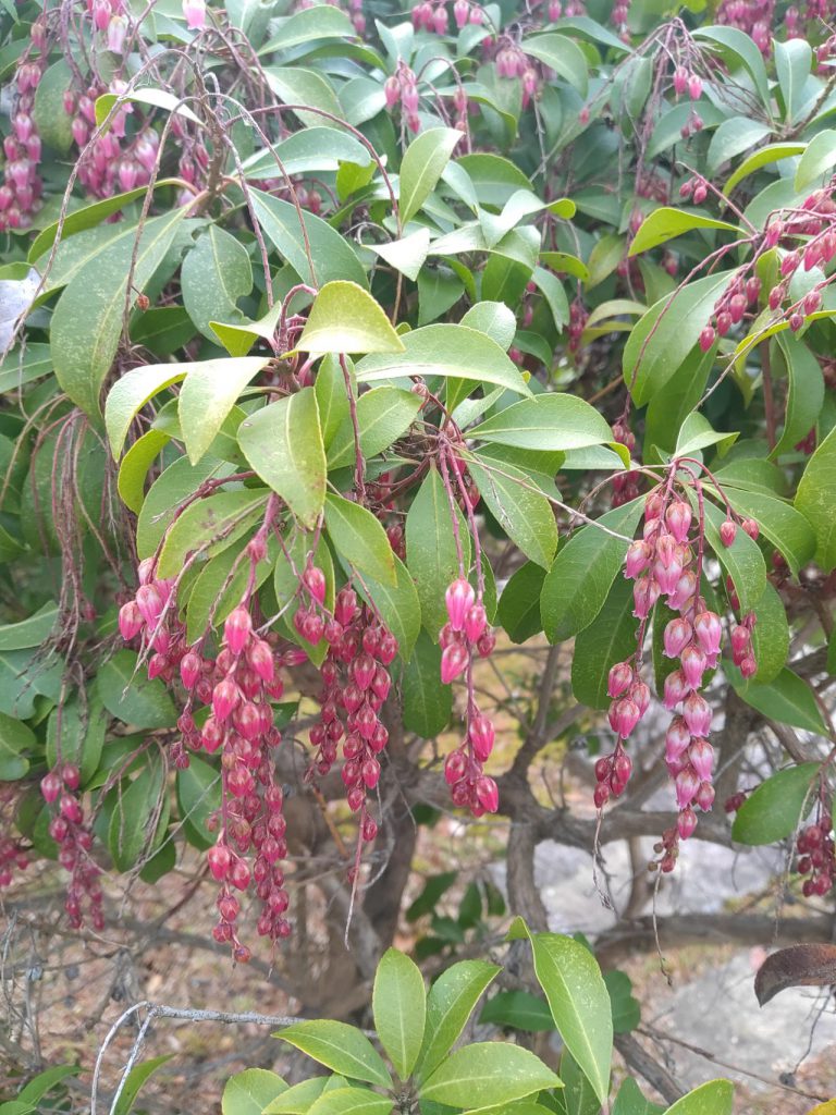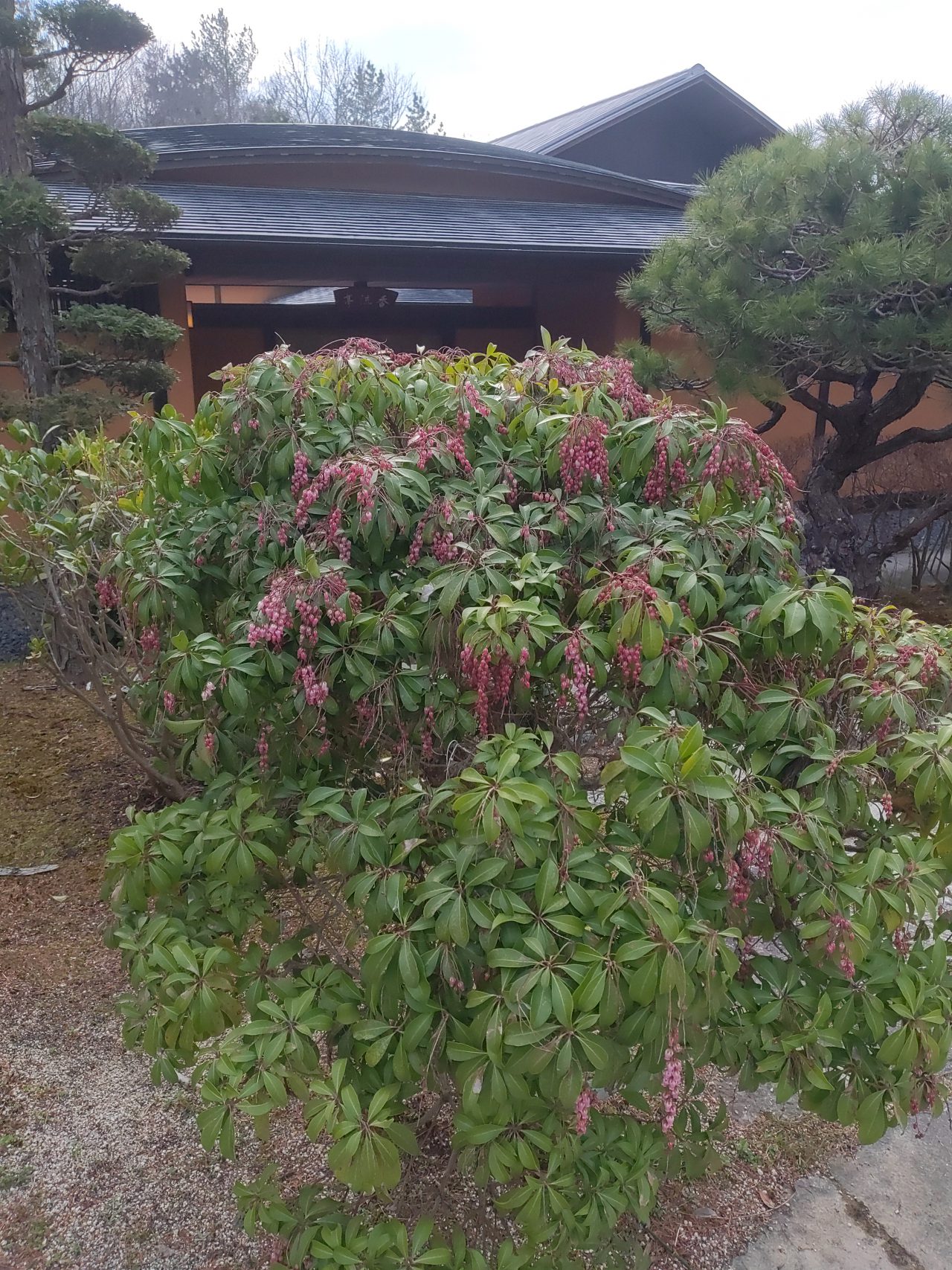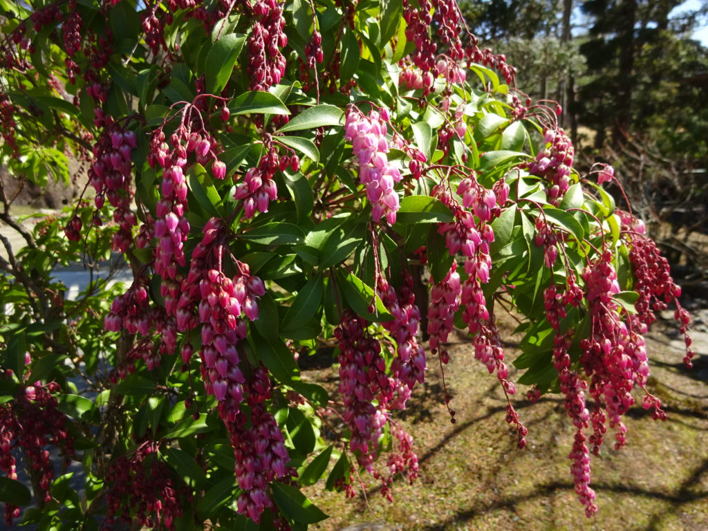 日本庭園茶室「香流亭」の横にあるアセビは薄紅色をしています。