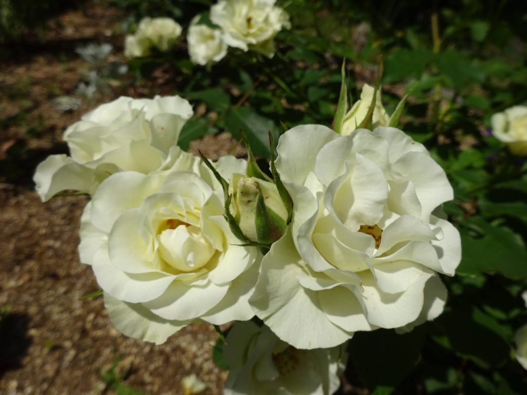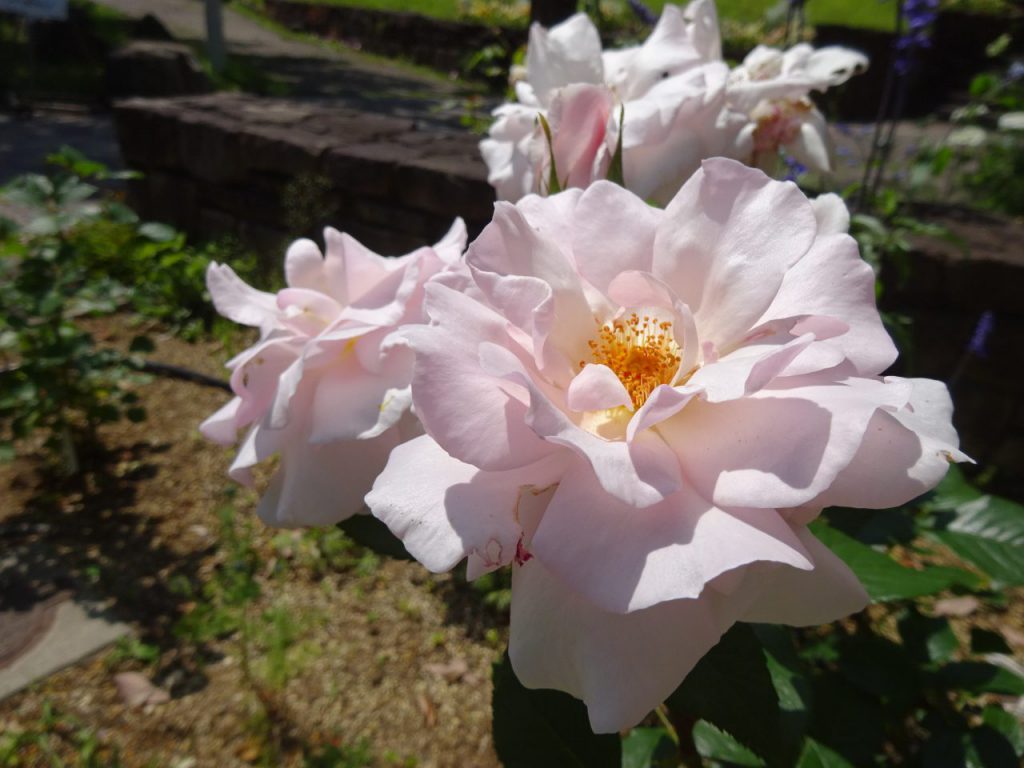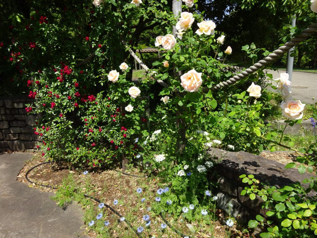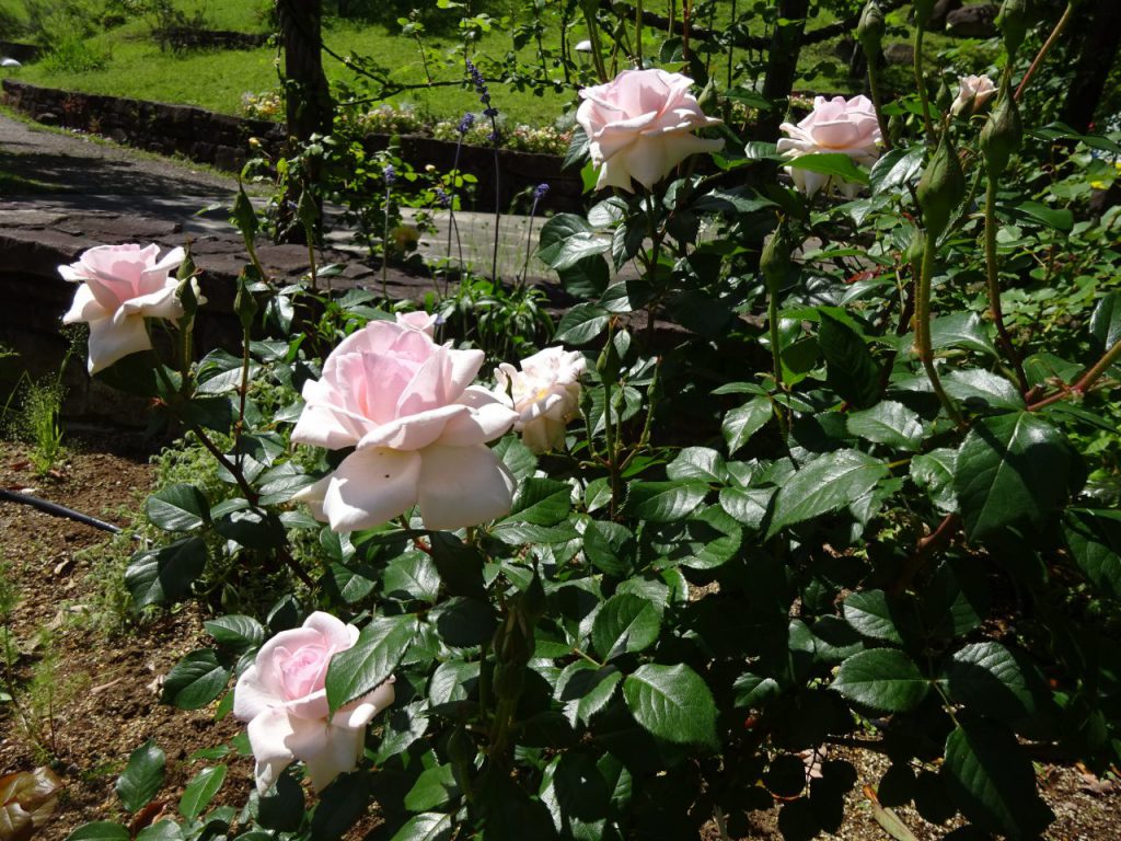 大花壇のバラが見頃です。小さなエリアですが、6種類のバラをご覧いただけます。