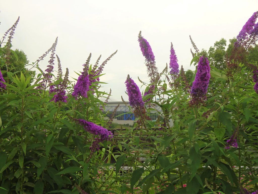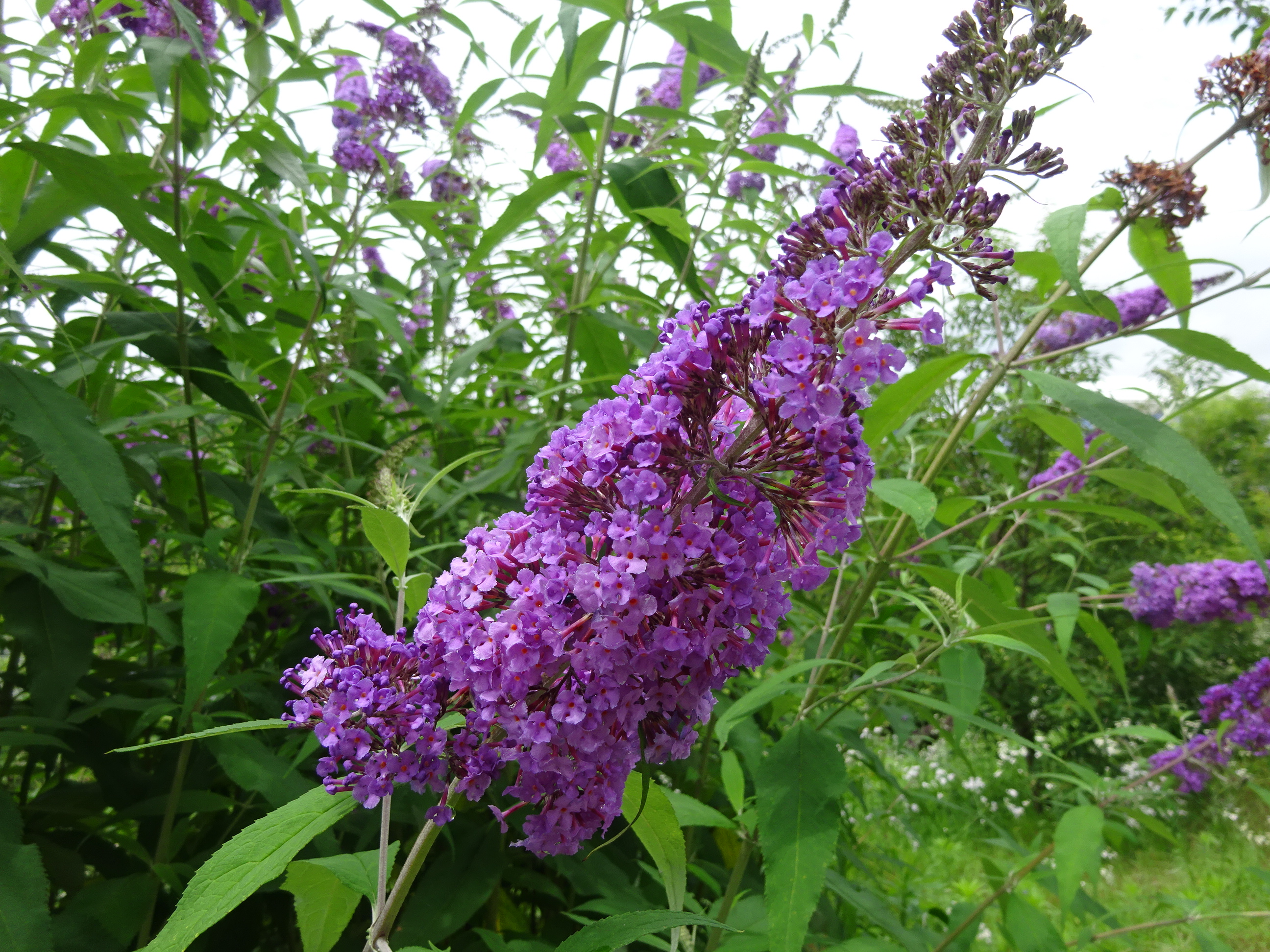 ブッドレアの大きな紫色の花が園路を彩っています。