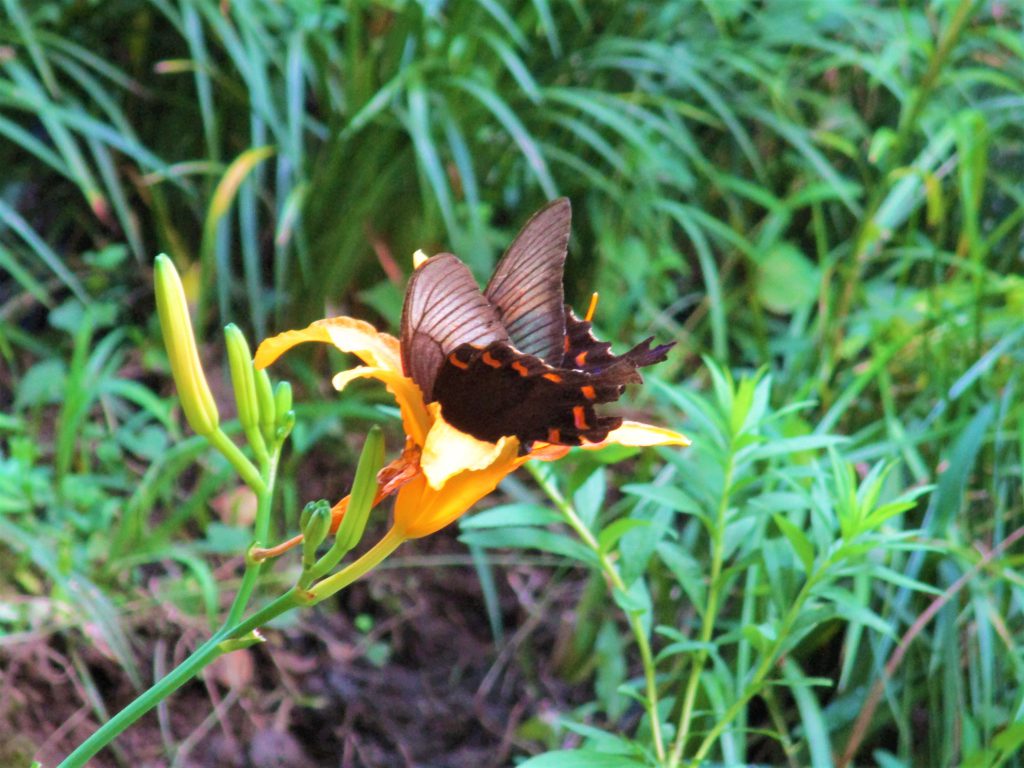 修景庭園池周りの南側散策路登り口に、今年もノカンゾウが咲きはじめました。