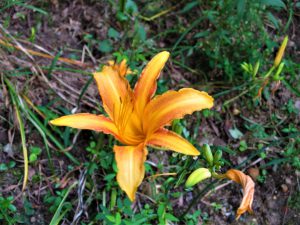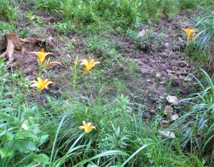 ノカンゾウが生育する周囲の環境は獣害により荒れていますが、それにも負けず、オレンジ色の花々が色鮮やかに開花しています。