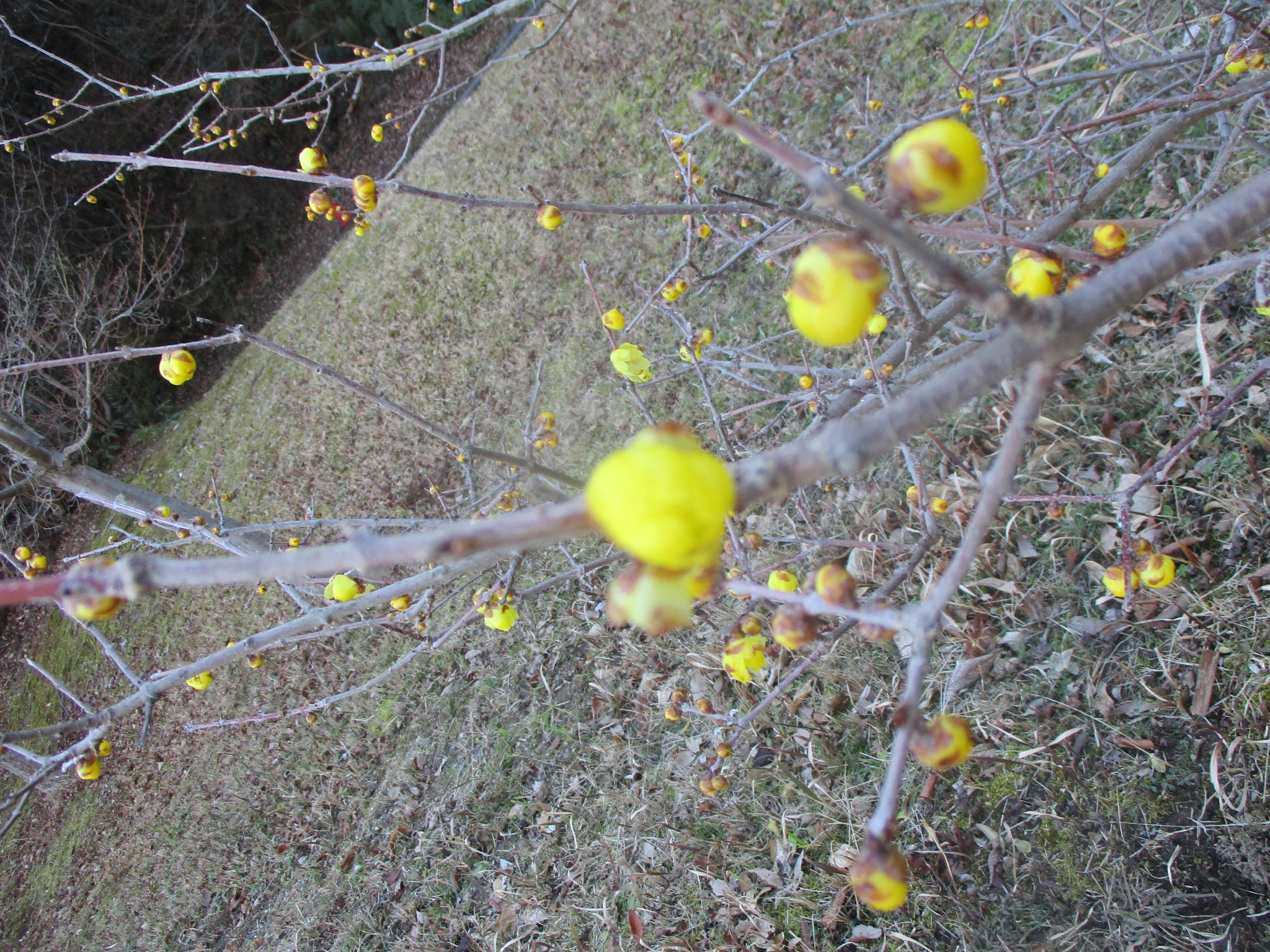 修景庭園へあがるスロープと近道のあいだに咲いたロウバイが