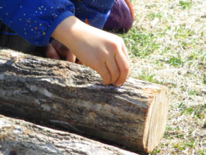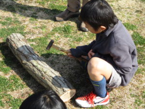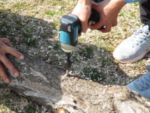 コナラにドリルで穴をあけ、コマ菌を詰めて、金づちでたたいて打ち込みます。