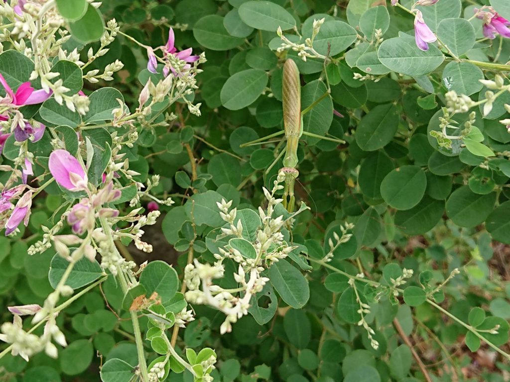 ハギの茂みの中では、カマキリが休憩していましたよ。