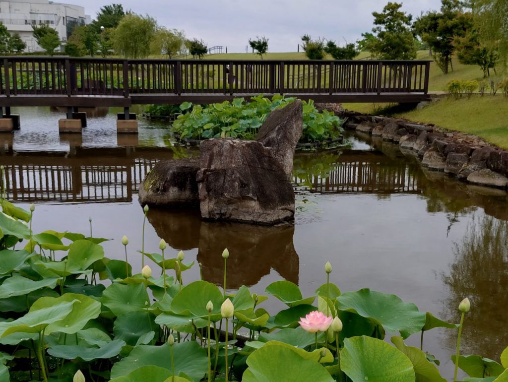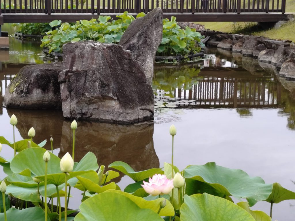 ハス池そのものが油ヶ渕に見立てて出来ており、八つ橋の部分が見合い橋