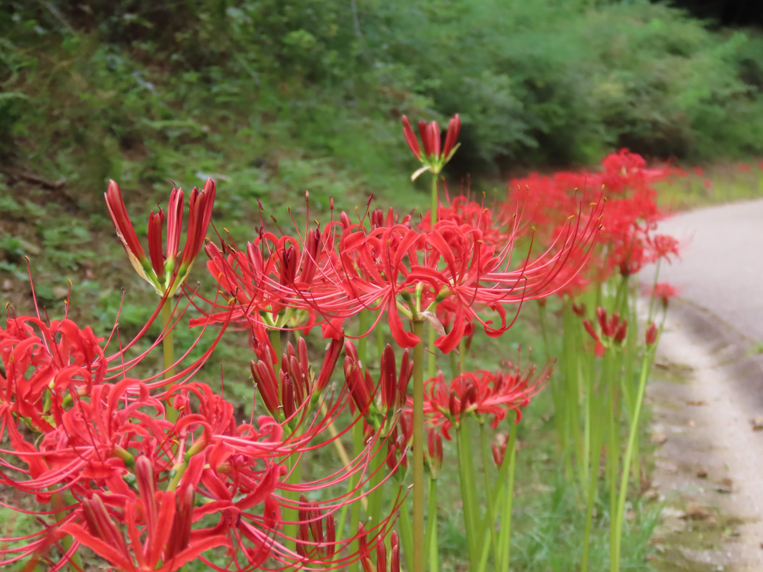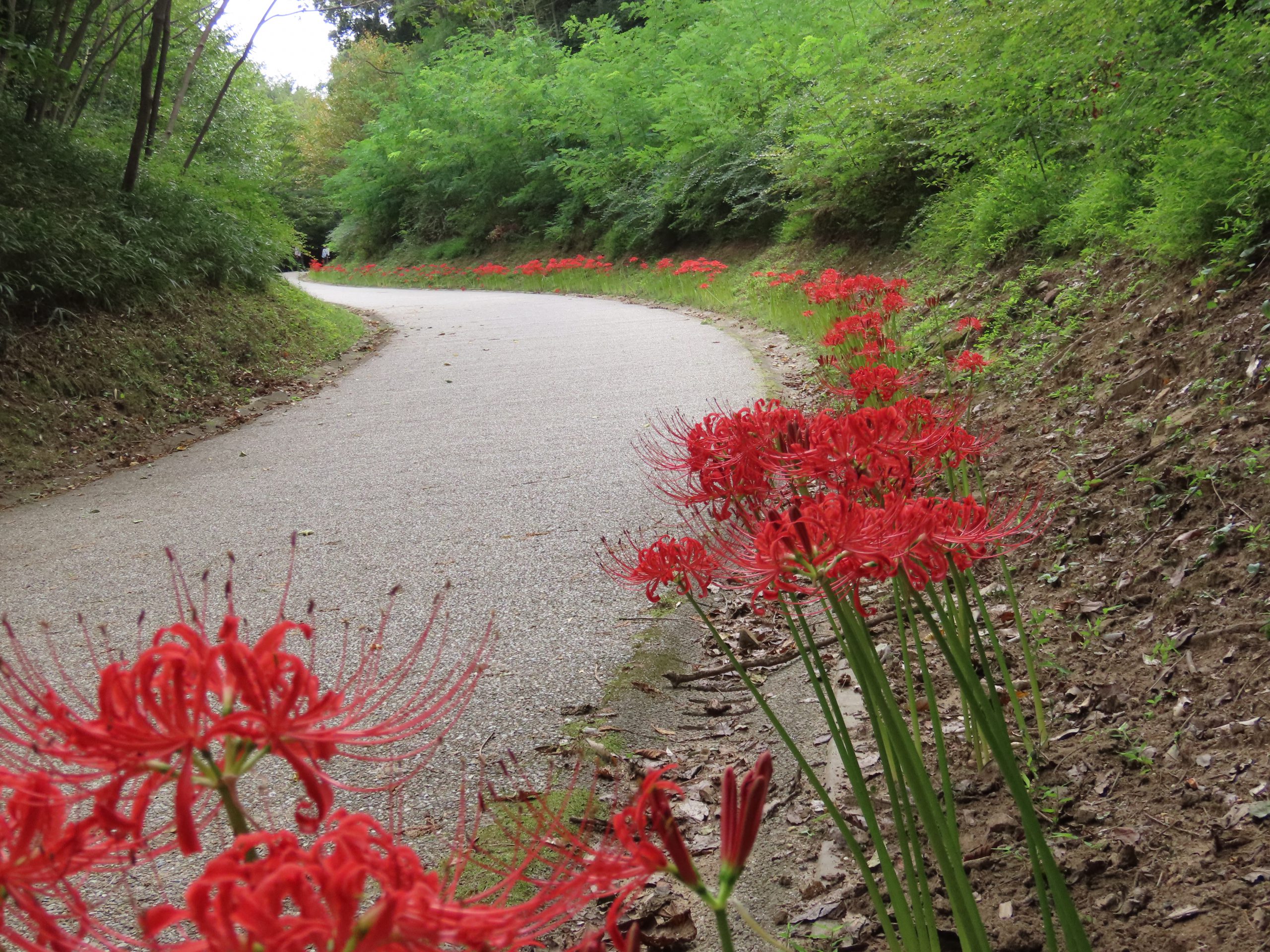 郷土の谷やごゆ側の主園路沿いで、ヒガンバナが見ごろを迎えています。