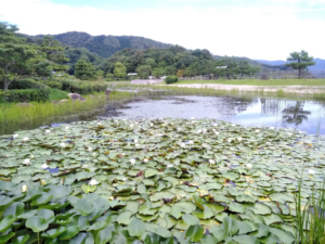修景庭園の池一面、たくさんのスイレンが開花してとてもキレイですよ。