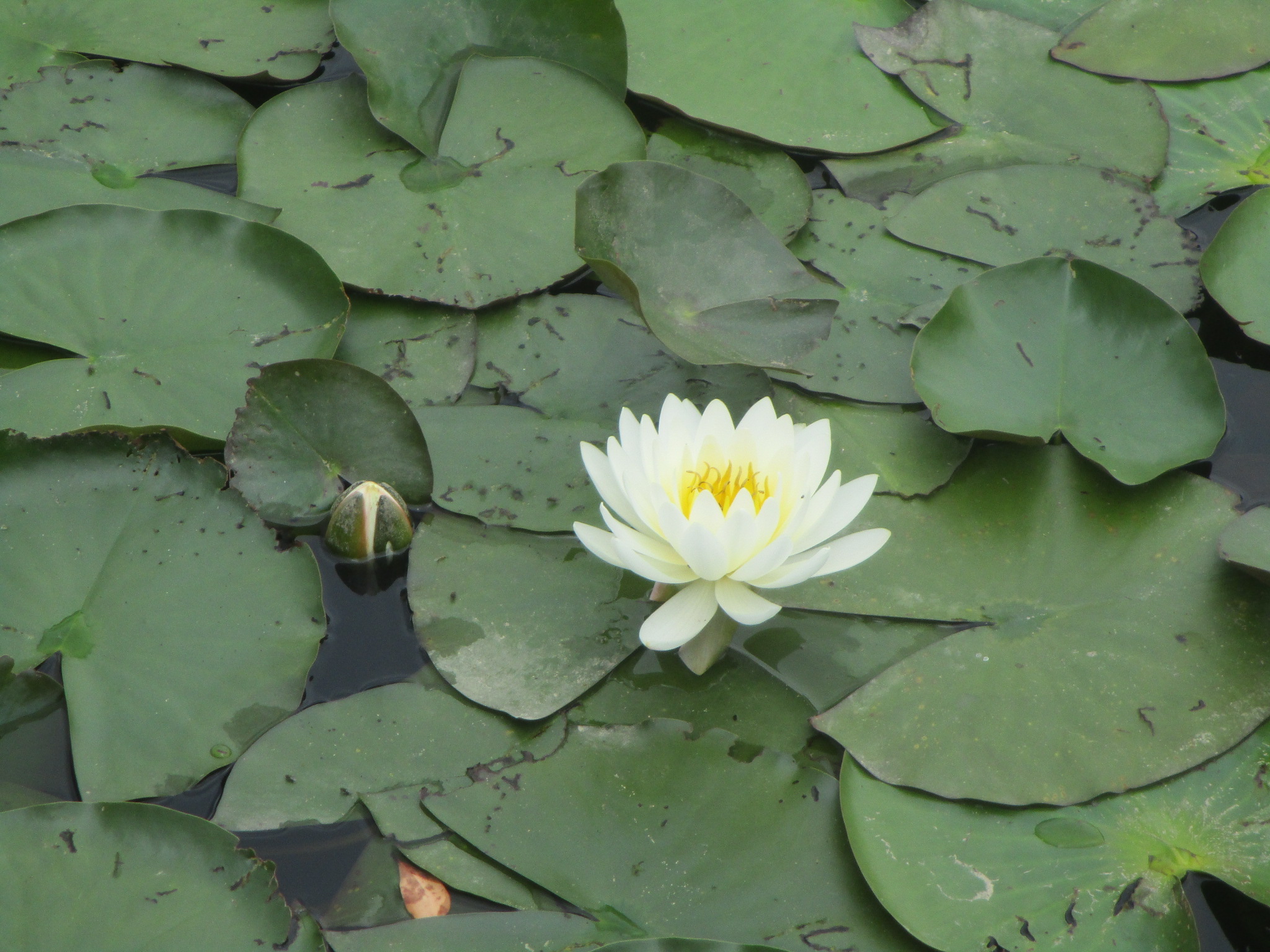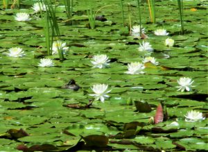 スイレンの花が咲いています。白色が先に咲くようで、赤色の花はまだ見ることができません。