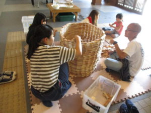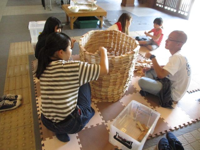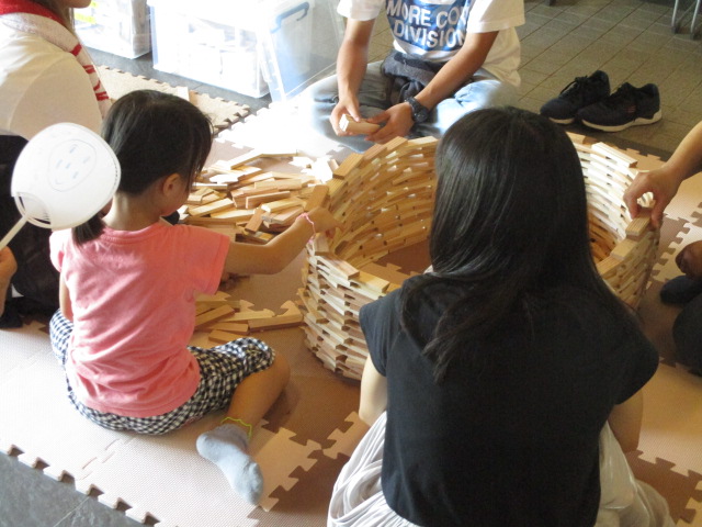 愛知大学の「森の子」さんによる、 間伐の杉を使ったつみきあそびも開催しています。