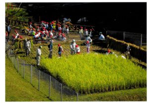 国府小学校1年生145名を迎え、三河郷土の谷の田んぼにて稲刈り体験を行いました。