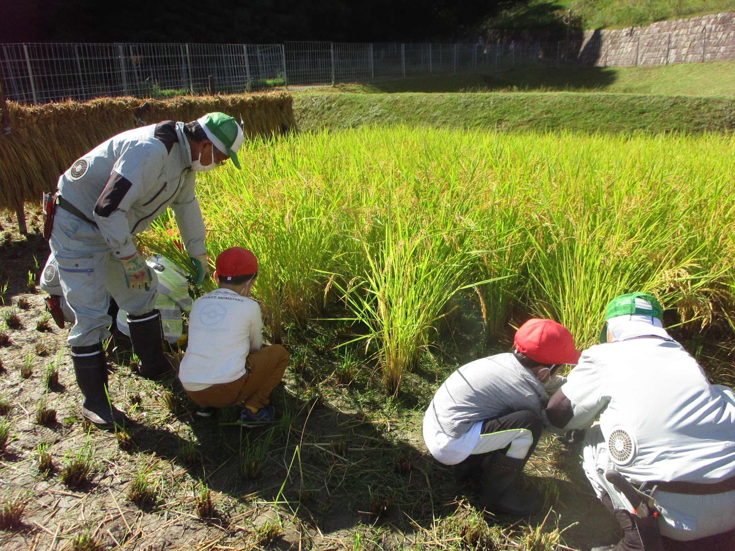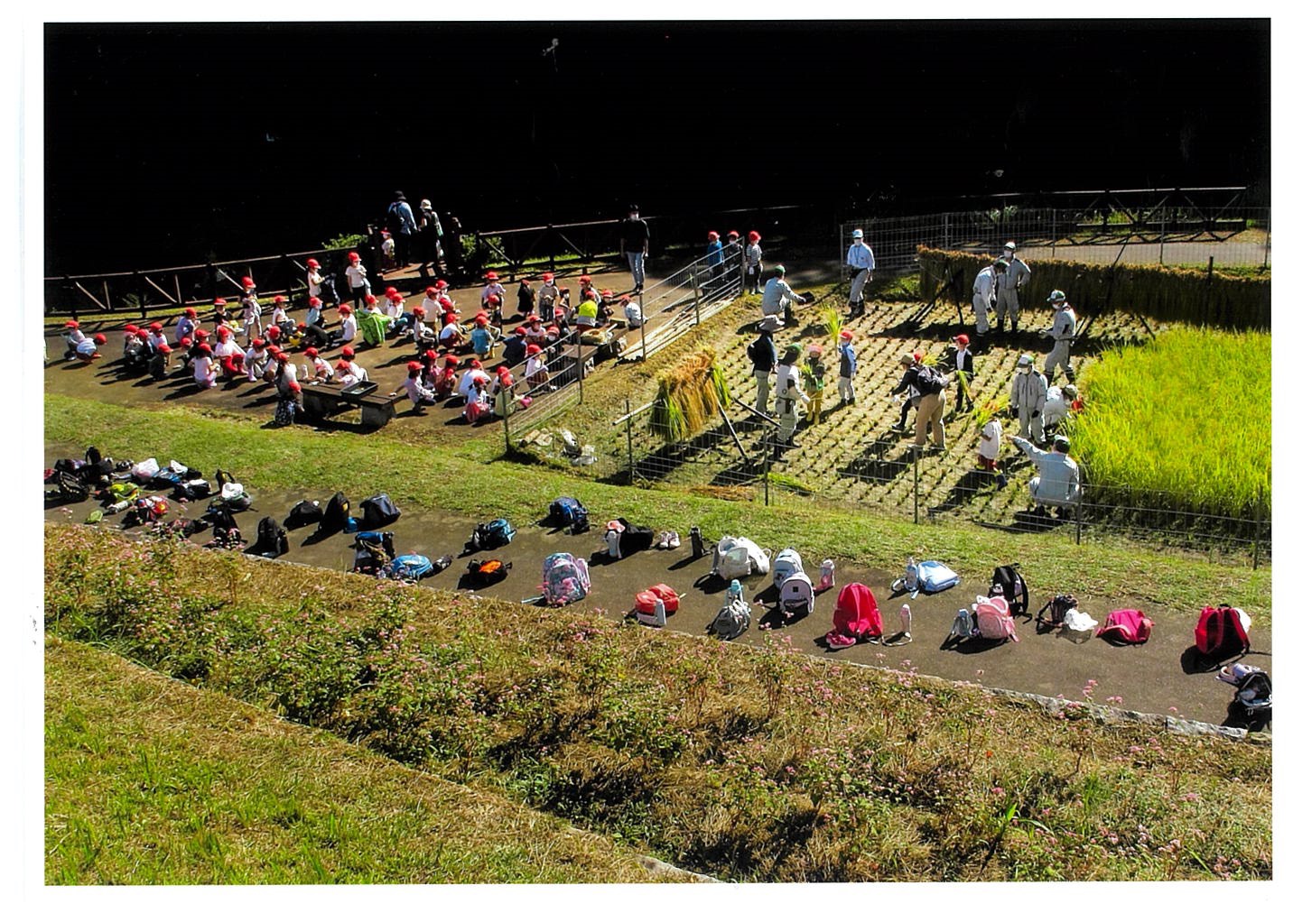 国府小学校1年生145名を迎え、三河郷土の谷の田んぼにて稲刈り体験を行いました。