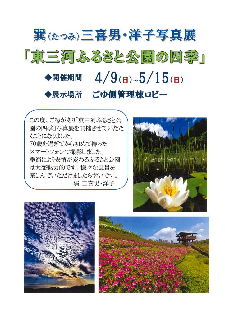 現在ごゆ側管理棟内にて「東三河ふるさと公園の四季」と題した写真展を開催しております。