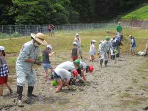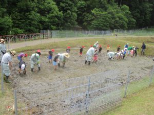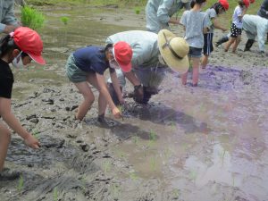 生き物に触れ合いながら、みんな一生懸命に田植えをしました!
