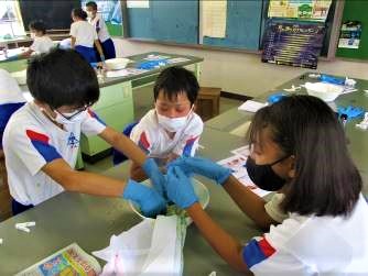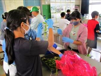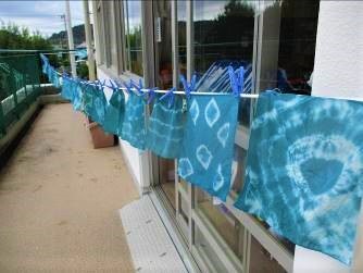 5,6年生の皆さんは、薄緑から藍色に変わっていく色の変化に驚き、楽しみながら、藍染めの体験をしてもらいました!