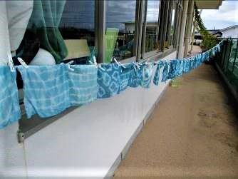 絞り染めの要領で、輪ゴムやビー玉で、思い思いの絵柄を想像しながら、柄を付けてもらいました。