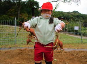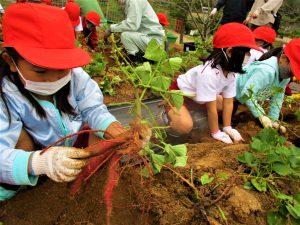 児童の皆さんは、小さな両手で、土と格闘しながら、懸命にサツマイモを掘っていただきました。〝もっと掘りたい!〟との声に嬉しく思いました。
