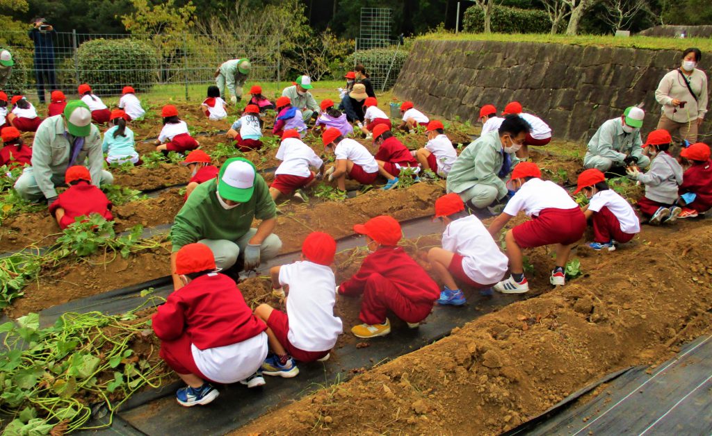 豊川市立御油小学校1年生児童71名を迎え、《修景庭園》奥の芋畑にて芋掘りを行いました。
