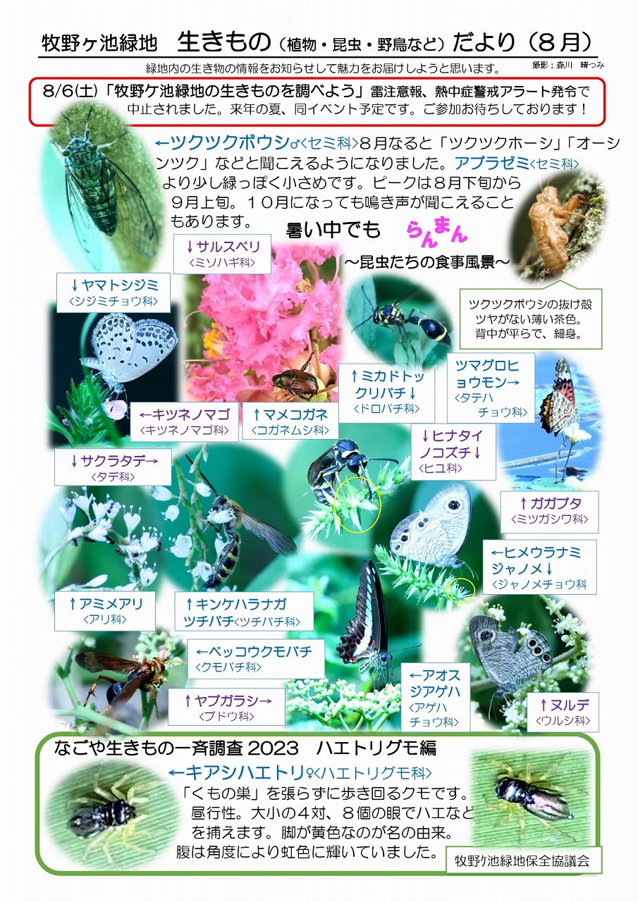 牧野ケ池緑地生き物だより(令和5年8月)が届きました。