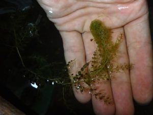 細かく分かれた葉にはたくさんの「補虫のう」がつき、水中の微生物を捕食する食虫植物です。