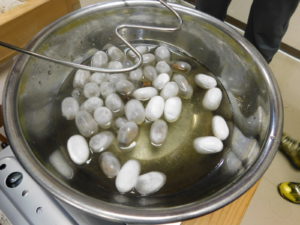 糸引きが進むにつれ、段々と繭が薄くなり、中のさなぎがうっすらと見えてきました\(◎o◎)/