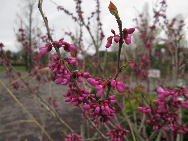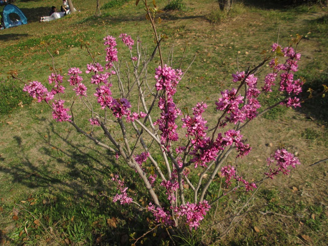 ハナズオウは 葉っぱが 出る前に 枝いっぱいに