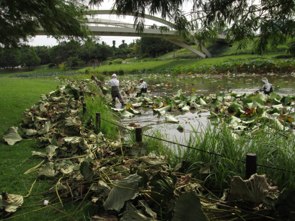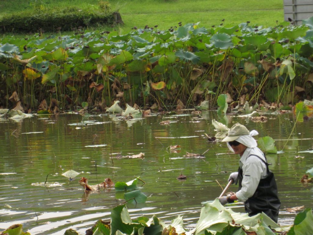 いのちの池のハスを一部 刈っています♪