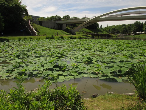 ハスの葉っぱが 水面から顔をだし 日に日に葉っぱが大きくなります