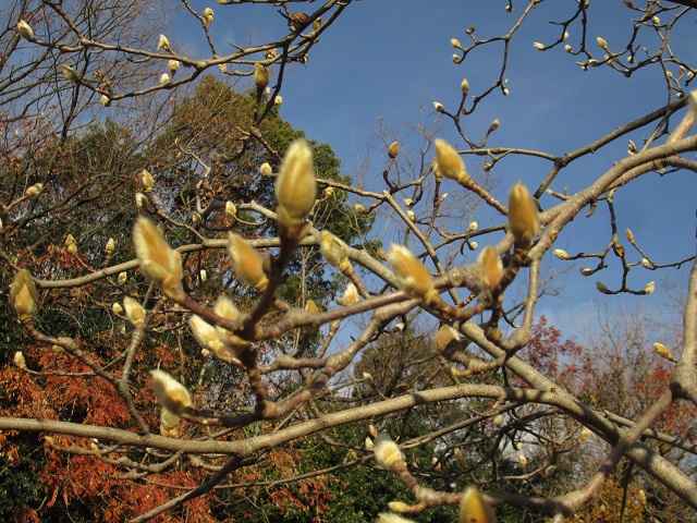 早春の3月頃に咲く花 ハクモクレンにつぼみがついています