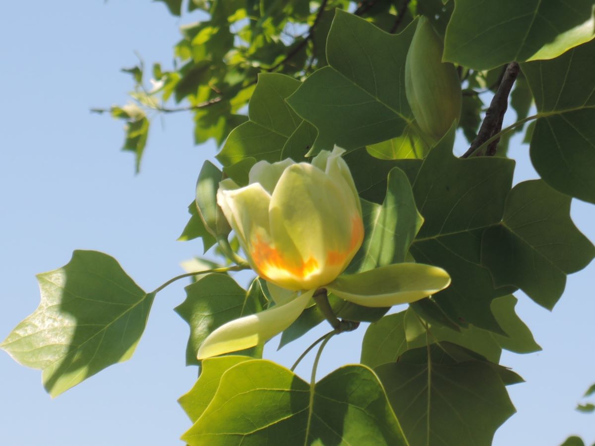 ゴールデンウィークのころ高い木の枝先に花をつけるユリノキ。