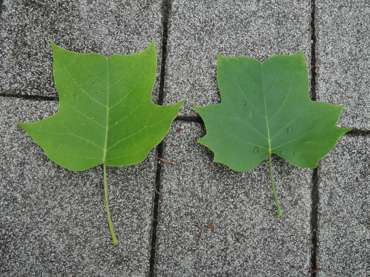 葉の形は(同じ木のなかでもバラつきがあるのですが)ユリノキ(右)のほうが葉の付け根に近い下半分に鋸歯(とがったところ)が複数個みられるものが多いようです。